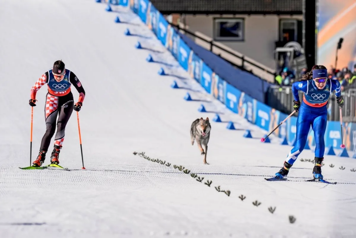 2月18日,越野滑雪女子团体短距离自由技术预赛闯入了一位特别的“选手”。雪白的赛道上,2岁的狼犬纳兹古尔突然入镜,和运动员们一起冲向终点。没有过激的慌张和驱逐,组委会反而为这只狗狗剪辑了冲刺慢镜头画面,还一本正经地分析了它冲线时的运动姿态。