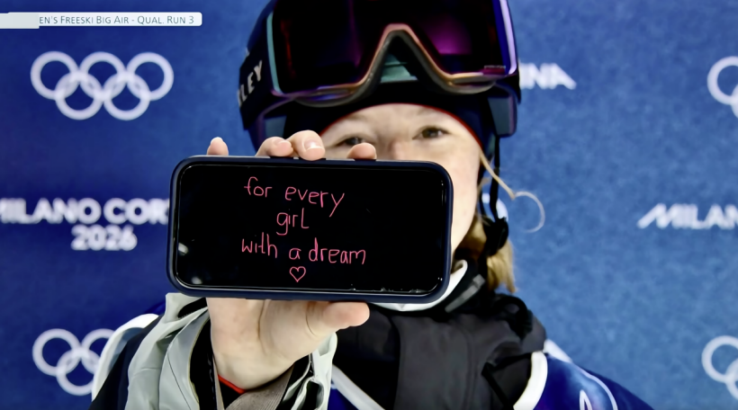 同样让人移不开眼的,还有19岁的德国选手默尔,她在完成自由式滑雪女子大跳台预赛第三跳后,向镜头展示了手机里的粉色字迹——“for every girl with a dream (致每一位心怀梦想的女孩)”。手机后,她浅色的双眸带着笑意。